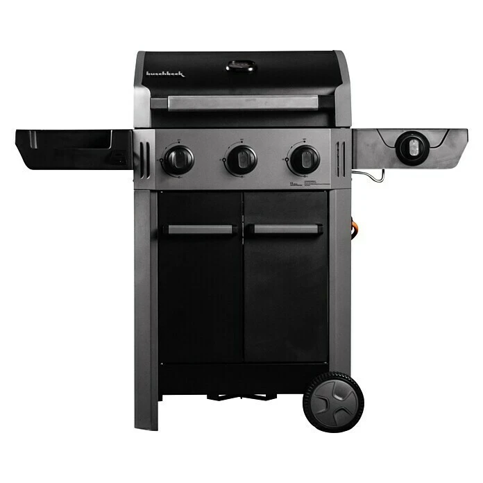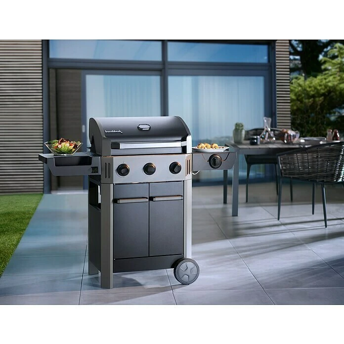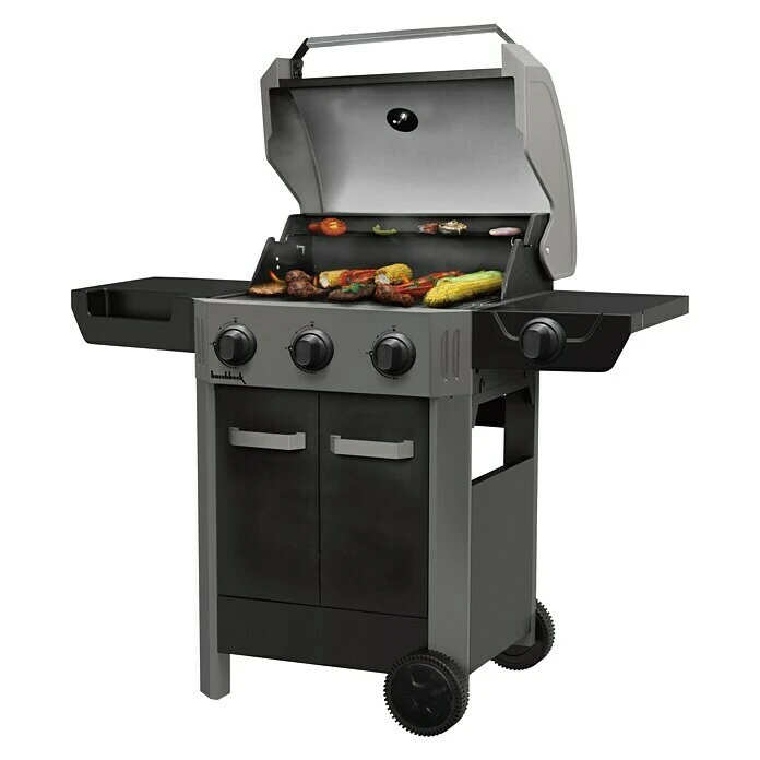 | Ausstattung | 2 Ablageflächen, 2 Räder, 2 Standfüße, 3 Regler, Deckelthermometer, Druckminderer, Emaillierte Gusseisengrillroste, Gasflaschenhalterung, Hitzebeständige Griffe, Piezo-Zündung, Schlauch, Seitenbrenner, Seitliche Ablagen, Unterschrank, Warmhalterost, Wetterfeste Räder |