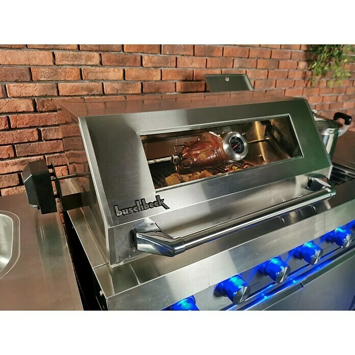 Die Buschbeck Outdoorküche Oxford ist aus hochwertigem Edelstahl gefertigt und überzeugt durch reichhaltige Ausstattung. Mit den vier leistungsstarken Edelstahlbrennen gelingen ganz einfach leckere Fleisch- oder Fischgerichte, während auf dem seitlich angebrachten Seitenkocher weitere Speisen im Topf oder Pfanne zubereitet werden können. Durch das praktische Sichtfenster und das integrierte Thermometer in der doppelwandigen Grillhaube, behalten Sie die volle Kontrolle und Übersicht über Ihr Grillgut. Unter dem Grill können in zwei Schubfächern Lebensmittel, Pfannen oder weiteres Zubehör aufbewahrt werden und sind so schnell griffbereit. Für ein kühles Getränk, während zum Beispiel das Grillgut gart, steht ein Kühlschrank ebenfalls mit Sichtfenster zur Verfügung. Im integrierten Spülbecken kann nach oder während des Grillens schnell und einfach das Grillbesteck gereinigt werden. Ein Anschlussschlauch und ein Gasdruckregler sind im Lieferumfang ebenfalls enthalten, sodass das Grillvergnügen sofort nach dem Aufbau starten kann. Mit dieser Outdoorküche sind Sie bestens gerüstet für das Kochen und Grillen unter freiem Himmel. Grills werden ohne Dekoration verkauft.