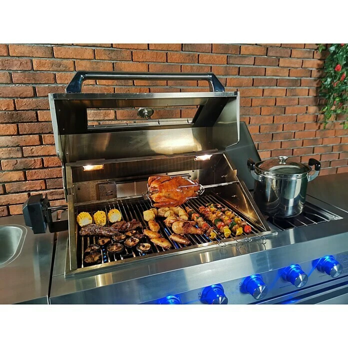 | Ausstattung | 4 Edelstahlbrenner, Beleuchtete Bedienknöpfe, Deckelthermometer, Doppelwandige Grillhaube, Druckregler, Kühlschrank, Rollen, Schlauch, Spülbecken, Unterschrank |