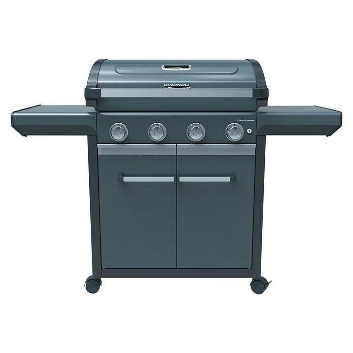 Der Campingaz Gasgrill 4 Series Premium ist ein hochwertiger Gasgrill, der ideal für 6 – 8 Personen geeignet ist. Seine vier Edelstahlbrenner, mit einer Leistung von 13,6 KW, befeuern das 72 x 46 cm große Gusseisen Grillrost, welches die Hitze gut speichert und die typischen Grillmuster auf dem Grillgut hinterlässt. Zusätzlich lassen sich mit dem Grillrost Einsätze des Campingaz Culinary Modular Systems verwenden, sodass noch mehr Gerichte mit dem Grill zubereitet werden können. Außerdem ist in dem Rost bereits ein Brennerschutz integriert, was separate Brennerabdeckungen überflüssig macht und das Aufflammen reduziert. Die beiden Seitentische können als Ablage- oder Arbeitsfläche genutzt werden und sind bei Bedarf abklappbar. So bleibt der Grill kompakt und kann dank seiner Rollen einfach bewegt werden. Im Unterschrank lassen sich Gasflachen bis zu 11kg Größe unterbringen, die mit dem im Lieferumfang enthaltenen Gasschlauch und Druckregler an den Grill angeschlossen werden können.
