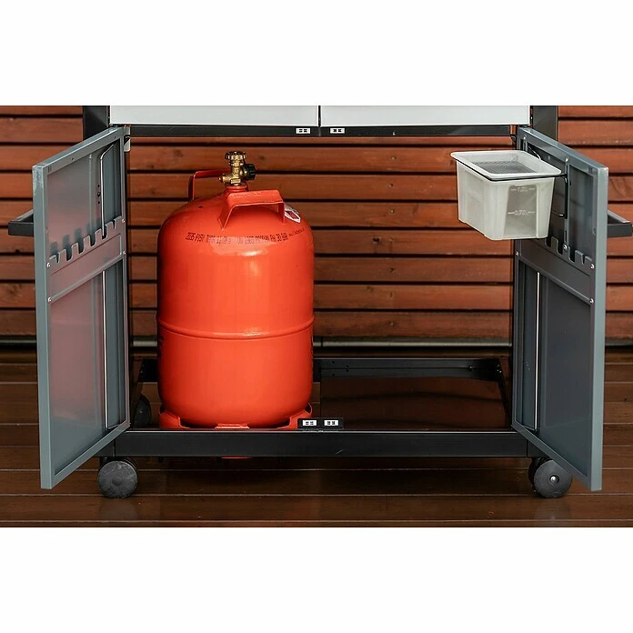 | Ausstattung | 4 Edelstahlbrenner, Deckelthermometer, Druckregler, Schlauch, Stauraum für Gasflasche, Unterschrank, Warmhalterost |