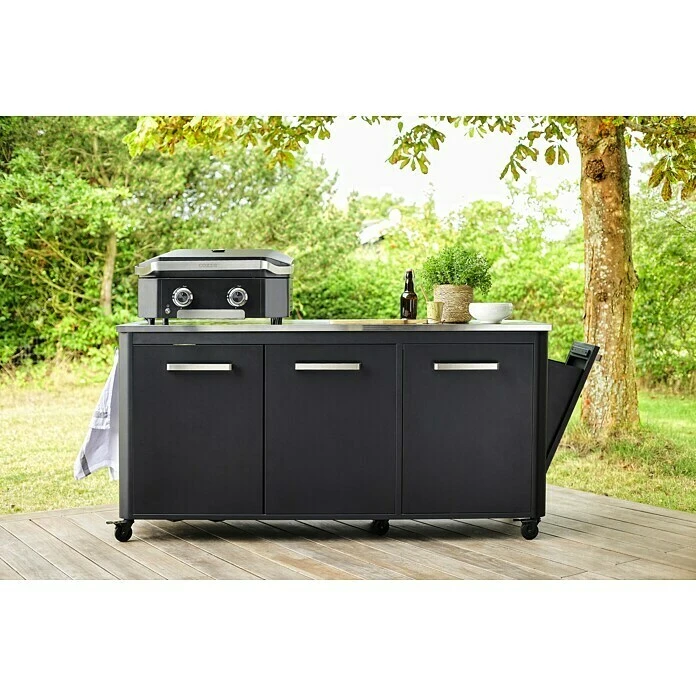 Das Sideboard besitzt 3 Schranktüren hinter denen allerlei Grillzubehör Platz findet und so stets auf der Terrasse oder im Garten zu Hand ist. In einem der Schänke ist zudem eine Gasflaschenhalterung untergebracht, sodass eine 11 kg Gasflasche sicher untergebracht werden kann. An der Seite befindet sich zusätzlich noch ein Abfallbehälter, der in der Grillküche für Ordnung sorgt.