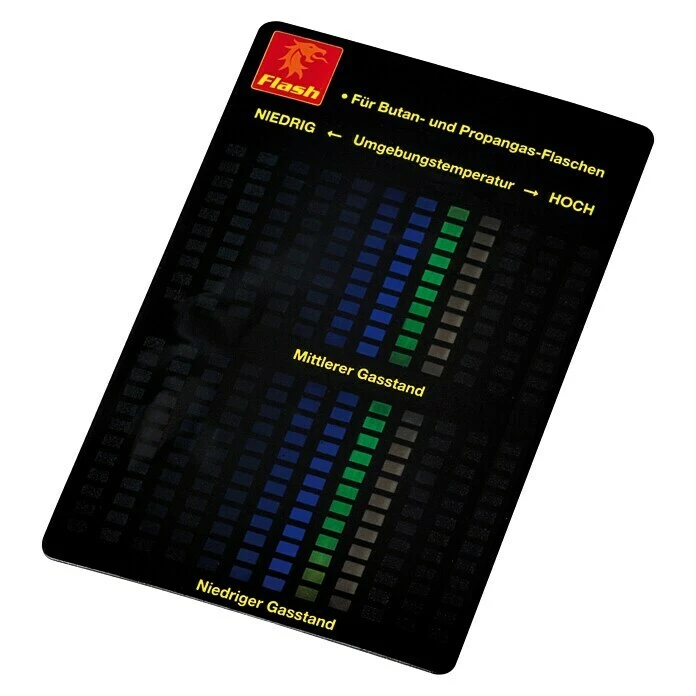 Der Gasflaschen-Füllstandsanzeiger von Flash ermöglicht schnelles und einfaches Ablesen des aktuellen Gasstandes in Propan- und Butangasflaschen. Hierfür wird der magnetische Anzeiger lediglich an die Flasche geheftet und zeigt mittels Temperaturerkennung den aktuellen Stand an. Er arbeitet bei einer Umgebungstemperatur zwischen 0 und 50 Grad.