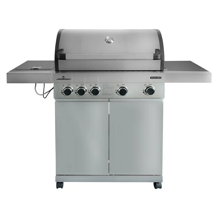 Der Gasgrill Atlanta II 450 von Grillstar überzeugt durch seine moderne Edelstahl-Optik und seine vielseitige Ausstattung. 4 Edelstahlgasbrenner ermöglichen eine Leistung von 17 kW auf der 71 x 18 cm großen Hauptgrillfläche. Der praktische Seitenkocher mit einer Leistung von 3 kW sowie die seitlichen Ablagen sorgen für mehr Ablage- und Arbeitsfläche. So lässt sich das Grillgut optimal zubereiten. Das integrierte Deckelthermometer in der doppelwandigen Grillhaube ermöglicht die genaue Temperaturermittlung. Der Gasgrill Atlanta II 450 verfügt zusätzlich über stabile Türen sowie praktische Rollen, die für mehr Mobilität sorgen. Somit steht einem tollen Grillerlebnis nichts mehr im Wege!