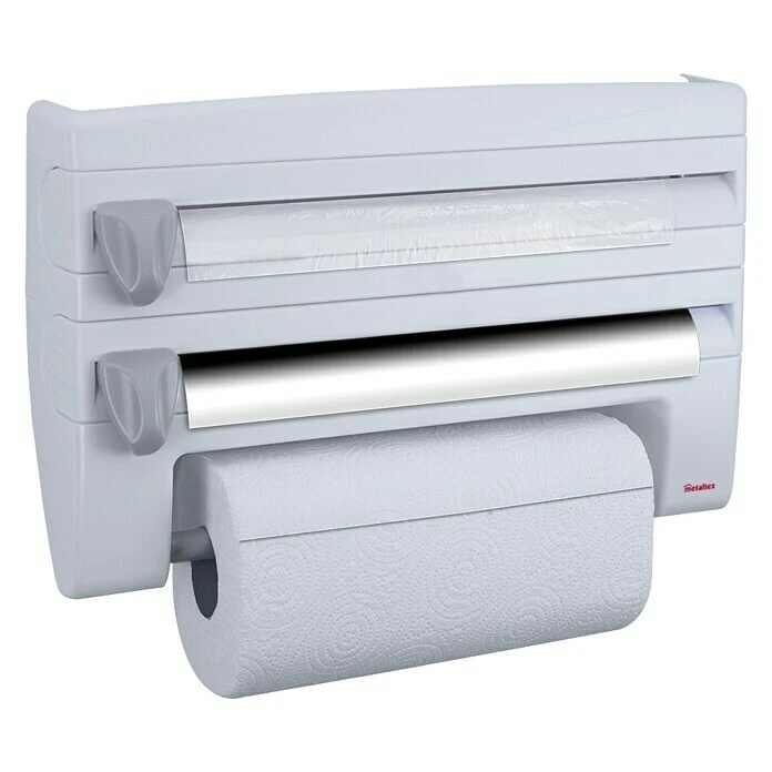 Der Küchenrollenhalter von Metaltex ist aus hochwertigem Kunststoff gefertigt. Die Halterung ermöglicht den problemlosen und bequemen Zugang zur Küchenrolle sowie zu zwei weiteren Rollen. Über diesen befindet sich zusätzlich jeweils ein Schneideschieber, der das Abtrennen der benötigten Stücke einfacher macht. Darüber hinaus ist der Küchenrollenhalter mit einem praktischen Gewürzregal versehen. Die Montage erfolgt über einfaches Schrauben.