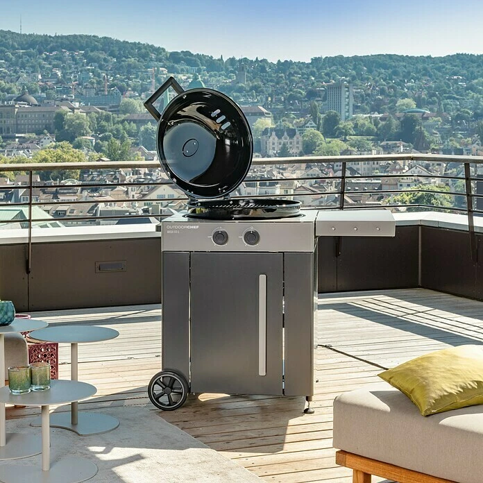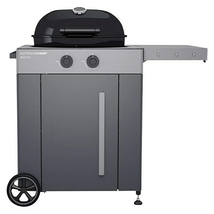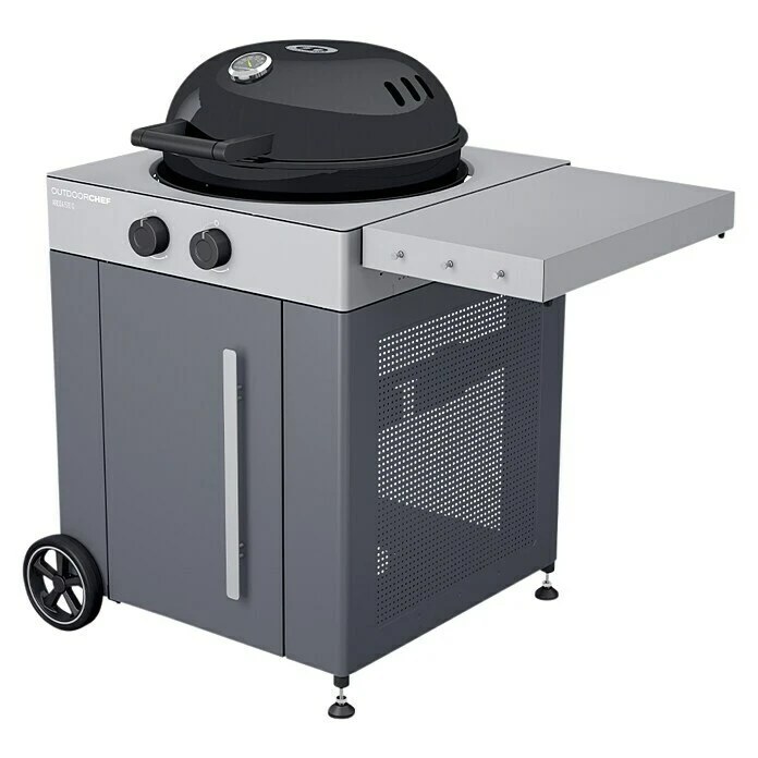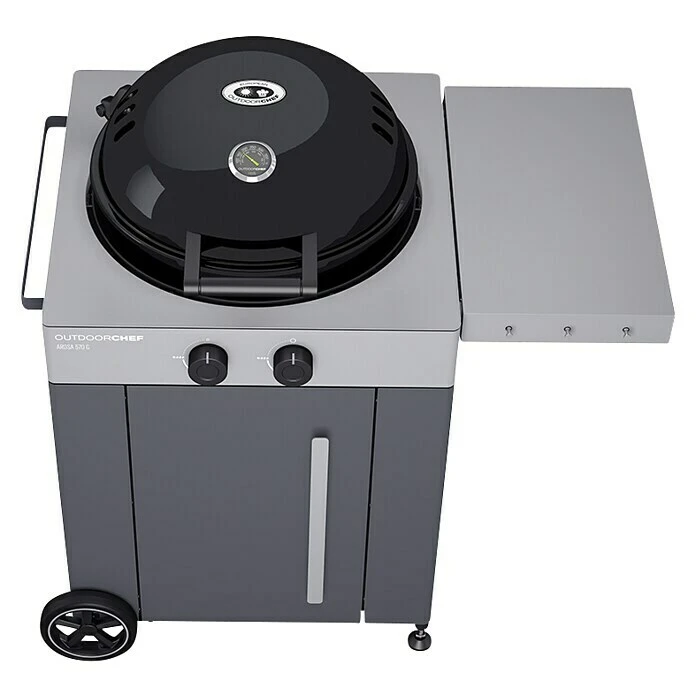 Der Outdoorchef Gaskugelgrill Arosa 570 G „Grey Steel“ verwandelt jeden Garten im Handumdrehen in einen Ort für eine Grillparty mit Familie und Freunden und überzeugt dabei mit seinem modernen, minimalistischen Design. Mit einem Grillrostdurchmesser von 54 cm können mühelos 6 bis 8 Personen und mehr verköstigt werden. Der hochwertige Grill steht auf einem stabilen, grauen Metallunterschrank, in dem auch gleichzeitig die Gasflasche gelagert werden kann. Durch seine 2 Rollen ist der Grill im gesamten Garten einsetzbar. Klappt man den arretierbaren Seitentisch aus, wächst der Grill von 85,5 cm Breite auf 113 cm Breite, sodass 27,5 cm Arbeitsfläche gewonnen werden. Dank seiner 2 Edelstahl Ringbrenner mit insgesamt 9,5 KW Brennerleistung und dem Outdoorchef Trichtersystem ist eine gleichmäßige Hitzeverteilung garantiert und es können Spitzentemperaturen von 500°C erreicht werden. Temperaturen von 80 – 360°C können, dank der Gourmet Burner Technology, sogar lückenlos eingestellt werden. Zudem sorgt das Flame Guard System dafür, dass die Brenner auch bei windigen Umgebungen nicht ausgehen. Perfekt also für Grillgut, das eine konstante Temperatur über einen langen Zeitraum benötigt. Ein weiteres Sicherheitsfeature ist das Safety Light, durch das die Drehregler beleuchtet werden, sobald sie aufgedreht sind. So hat man jederzeit im Blick, ob das Ventil offen oder geschlossen ist. Abgerundet wird der Grill durch praktische Zusatzfunktionen wie dem seitlichen Handtuchhalter und den Besteckhalterungen am Seitentisch. So ausgestattet steht der nächsten Grillparty nichts mehr im Weg.