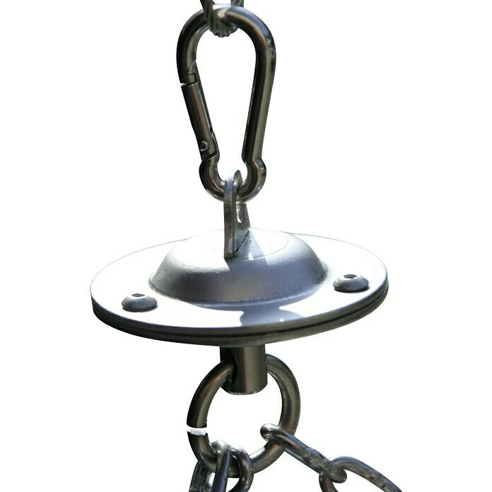Dieser kugelgelagerte Seilwirbel sorgt für eine langanhaltende Drehung des Grillrostes. Einmal in Bewegung, sorgt der Seilwirbel dafür, dass der Rost sich etwa acht Minuten lang dreht, ohne dass sich dabei die Ketten verdrehen oder verheddern. Die beiden Hälften dieses Drallfängers sind gegeneinander beweglich: Die untere Hälfte bewegt sich mit dem Rost, während die obere Hälfte die kinetische Energie abfängt. Die Witterungsbeständigkeit des hitzebeständigen und lebensmittelechten Seilwirbels garantiert außerdem eine lange Lebensdauer.