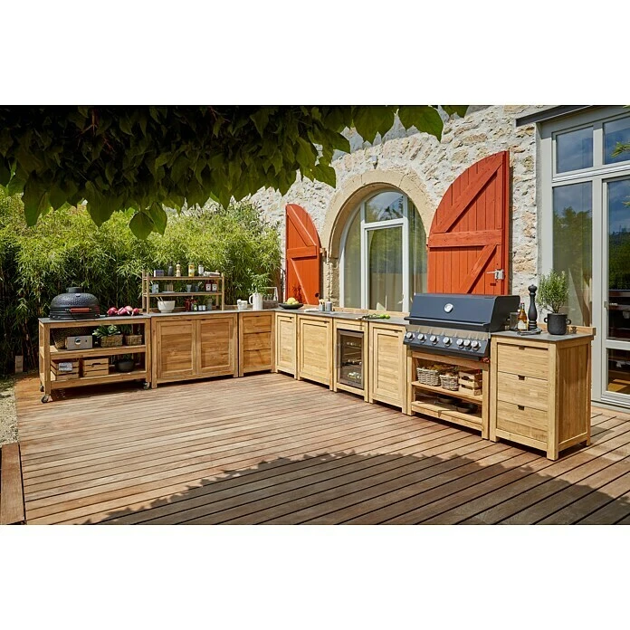 Mit den Zoe Teak Grillküchen-Modulen kann eine individuelle Outdoor-Küche zusammengestellt werden, welche durch verschiedene Kombinationen ideal an die Gegebenheiten auf der eigenen Terrasse oder im heimischen Garten angepasst werden kann.