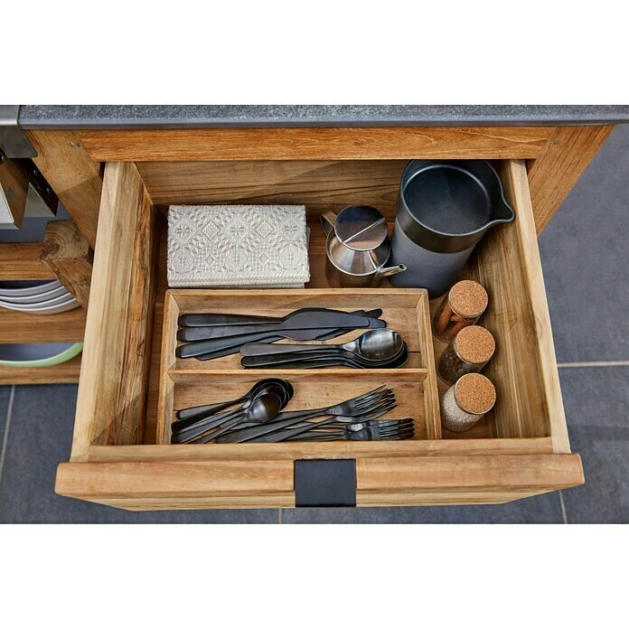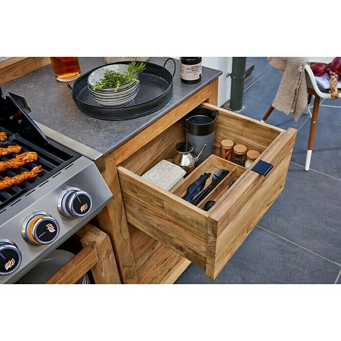 Mit den Zoe Teak Grillküchen-Modulen kann eine individuelle Outdoor-Küche zusammengestellt werden, welche durch verschiedene Kombinationen ideal an die Gegebenheiten auf der eigenen Terrasse oder im heimischen Garten angepasst werden kann.