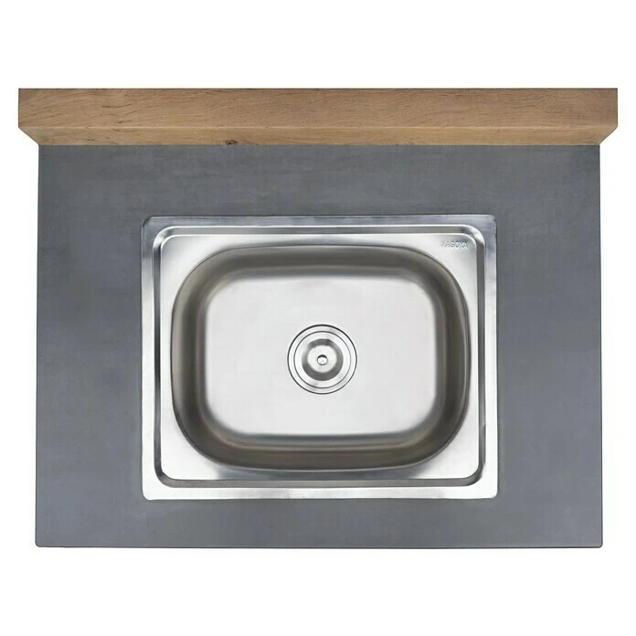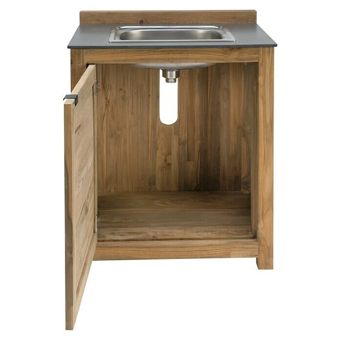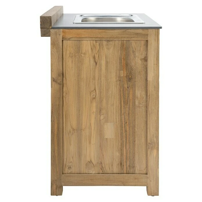 Das Waschbecken Modul besitzt eine Spüle aus Edelstahl, die bei Nichtgebrauch mit einer Teakholzplatte abgedeckt werden kann, sodass zusätzliche Ablagefläche oder Arbeitsfläche entsteht. Eine Spülarmatur lässt sich über eine vorbereitete Öffnung einfach montieren. So ausgestattet, lassen sich Gemüse, Salat oder auch Teller und Pfannen schnell und direkt, draußen abbrausen, sodass sie sofort verarbeitet oder genutzt werden können.