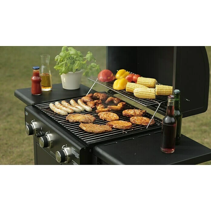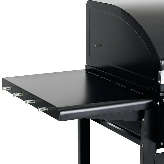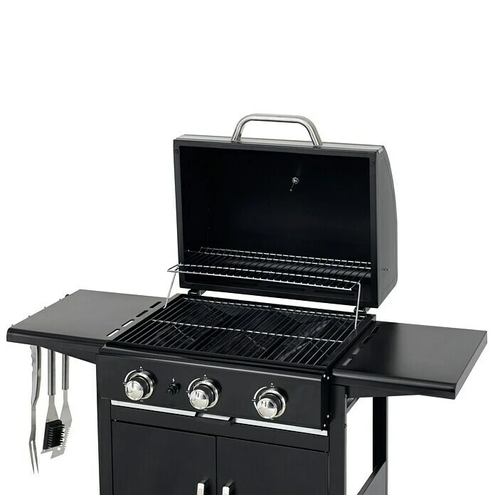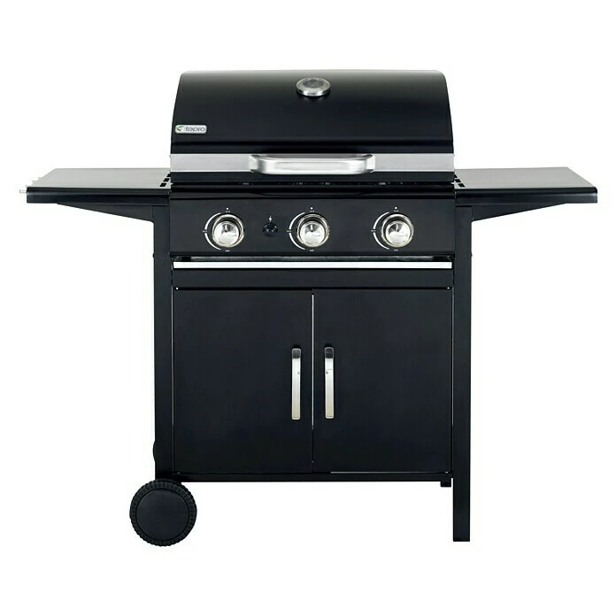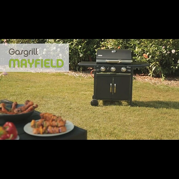 Der Gasgrill Mayfield 3von Tepro überzeugt mit seiner schwarzen Optik und den silbernen Akzenten. 3 Edelstahlbrenner mit 9 kW Gesamtleistung befeuern das 55 x 44 cm große, zweigeteilte, verchromte Grillrost. Über eine elektrische Zündung lassen sich die Brenner leicht und sicher starten, sodass nach kurzer Aufheizzeit das Grillgut aufgelegt werden kann. Zwei seitliche Ablagen bieten eine großzügige Ablagefläche, sodass das Grillgut oder auch die Grillzange griffbereit am Grill parat gelegt werden kann. Über ein Deckelthermometer lässt sich jederzeit die Temperatur im Inneren des Grills kontrollieren und bei Bedarf über die Drehregler nachjustieren. Im stabilen Unterschrank lassen sich Gasflaschen von 5 – 8 kg unterbringen, die in einer passenden Halterung sicher stehen. Bei Nichtgebrauch oder wenn an einem anderen Ort gegrillt werden soll, lässt sich der Grill durch seine wetterfesten Räder einfach verschieben. So steht einem entspannten Grillabend nichts mehr im Wege.