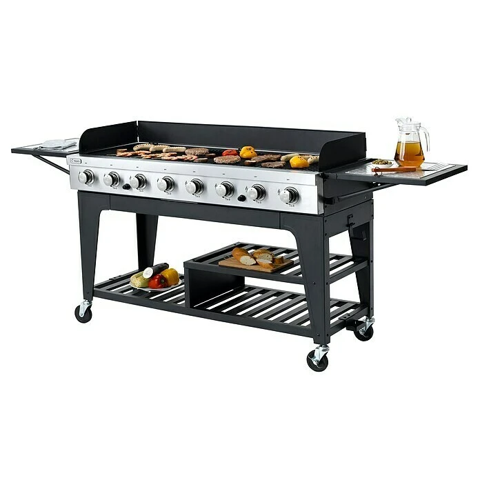 Der Tepro Gasgrill Montgomery mit 8 Edelstahl-Brennern ist ein leistungsstarker Grill, der sich vor allem für große Grillmengen eignet. Die Hauptgrillfläche von 136 x 48 cm bietet besonders viel Platz. Somit eignet er sich perfekt für den gewerblichen Einsatz. Über den im Drehregler integrierten Piezo-Zünder werden die getrennt regelbaren Brenner gezündet, sodass sich die Temperatur gleichmäßig auf der Grillfläche verteilt. Für den Betrieb aller acht Brenner gleichzeitig werden zwei separate Gasflaschen benötigt, die ganz einfach an die zwei separaten Anschlüsse angebracht werden können. Durch den Windschutz an drei Seiten des Grills wird eine schnelle Garzeit gewährleistet. Mit den seitlich abklappbaren Ablageflächen sowie dem Untergestell ist genügend Platz für weitere Grilluntensilien vorhanden. Die emaillierten Stahlgrillroste lassen sich schnell und mühelos reinigen. Anschließend kann der Grill in der mitgelieferten Abdeckhaube geschützt verstaut werden.