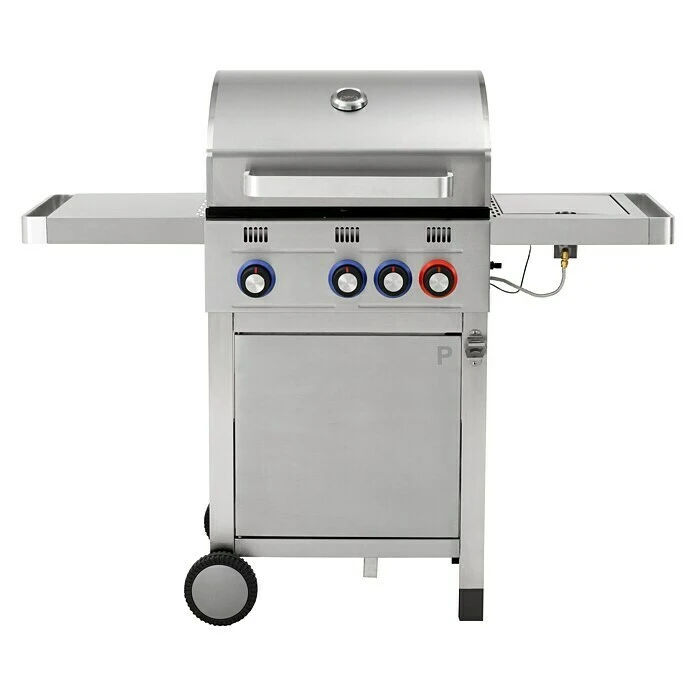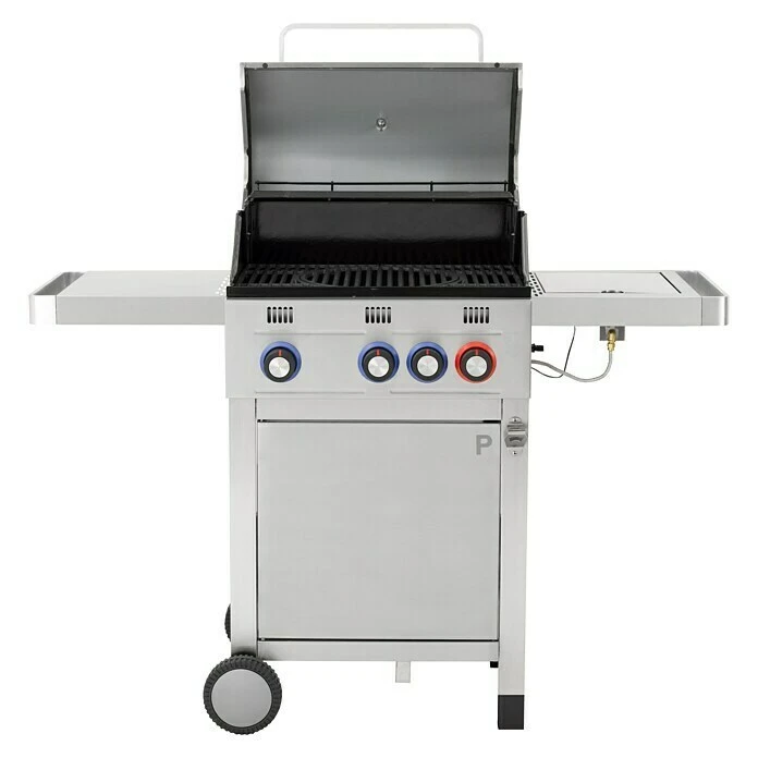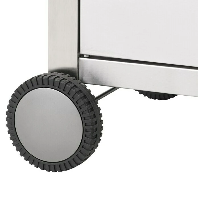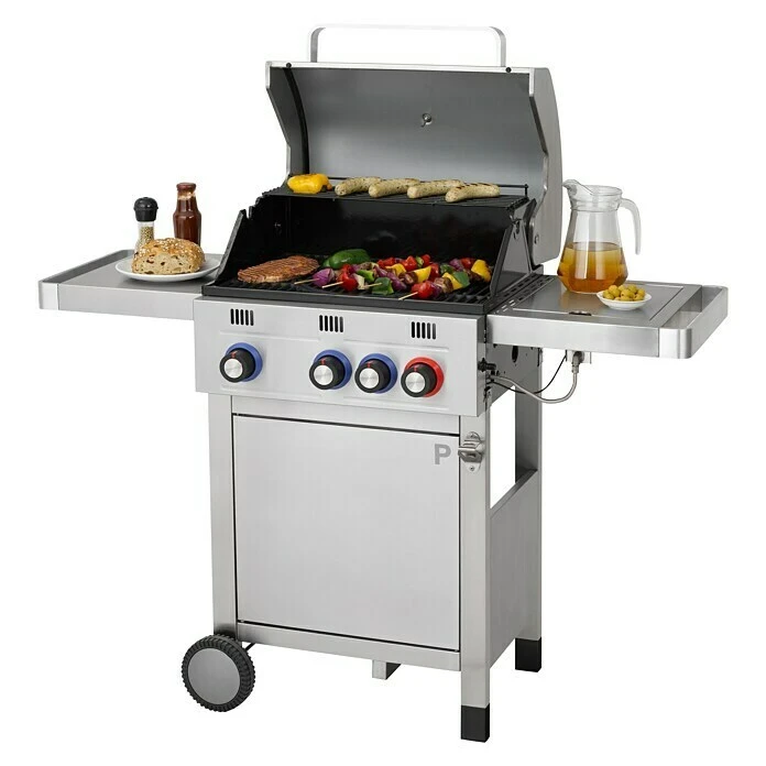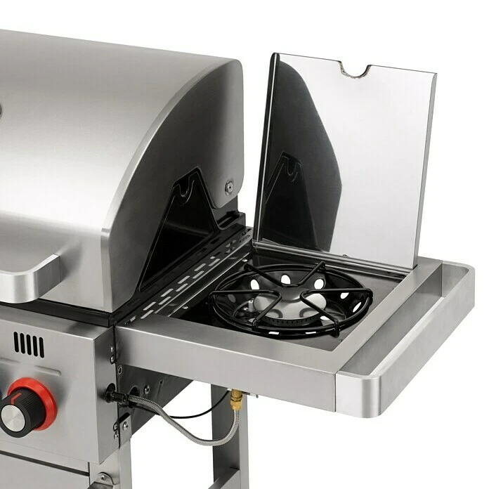 Der Gasgrill Wellington von Tepro überzeugt mit seiner modernen Edelstahl Optik und seinen vielseitigen Einsatzmöglichkeiten. 2 Edelstahlbrenner mit 6,4 kW Leistung und 1 Edelstahl Powerzone Brenner mit 4,6 kW Leistung befeuern das 56 x 38 cm große, zweigeteilte Gusseisen Rost. Das Rost lässt sich zudem mit Tepro Rost in Rost Einsätzen vielfältig erweitern. Über eine, im Drehregler integrierte, Piezo Zündung lassen sich die Brenner leicht starten, sodass nach kurzer Aufheizzeit das Grillgut aufgelegt werden kann. Zwei seitliche Edelstahlablagen bieten eine großzügige Ablagefläche, sodass das Grillgut oder auch die Grillzange griffbereit am Grill parat gelegt werden kann. Eine der beiden Ablage beinhaltet einen Seitenkocher mit 3,6 kW Leistung, auf dem Topf- und Pfannengerichte zubereitet werden können. Über ein Deckelthermometer lässt sich jederzeit die Temperatur im Inneren des Grills kontrollieren und bei Bedarf über die Drehregler nachjustieren. Im stabilen Unterschrank lassen sich Gasflaschen unterbringen, die in einer passenden Halterung sicher stehen. Bei Nichtgebrauch oder wenn an einem anderen Ort gegrillt werden soll, lässt sich der Grill durch seine wetterfesten Kunststoffräder einfach verschieben. So steht einem entspannten Grillabend nichts mehr im Wege.