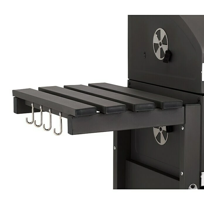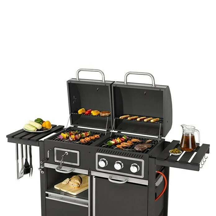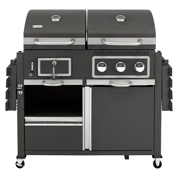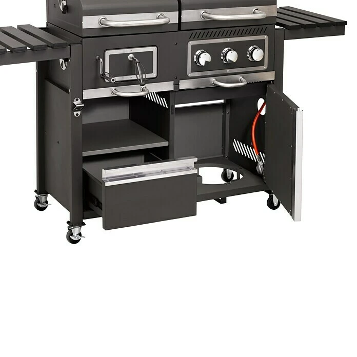 Der Tepro Hybrid-Grill Toronto Kombi ist der ideale Grill, wenn Sie sich nicht zwischen der einfachen Handhabung eines Gasgrills und dem Geschmack von über Holzkohle gegartem Grillgut entscheiden können. Mit diesem Grill kombinieren Sie beide Befeuerungsarten und nutzen je nach Lust und Laune eine der Beiden oder beide Zusammen. Auf der 41,3 x 41,3 cm großen Gasgrillfläche mit verchromten Grillrosten, lässt sich über 3 Brennern mit 8,7 KW Gesamtleistung mit Gas grillen. Die Holzkohlegrillfläche ist 38,5 x 41,3 cm groß und besitzt ebenfalls verchromte Grillroste. Die Holzkohleschale lässt sich zur Hitzeregulierung mittels Kurbel höhenverstellen. Die Gasflasche kann bequem im Unterschrank verstaut werden und ist über die vordere Tür jederzeit zugänglich. Gasschlauch und Gasdruckregler sind ebenfalls im Lieferumfang enthalten, sodass die Gasflasche sofort angeschlossen werden kann. Durch seine vier Rollen kann der Grill an fast jeden beliebigen Ort in Ihrem Garten geschoben werden, sodass Sie immer an den schönsten Plätzen Ihres Gartens grillen können.