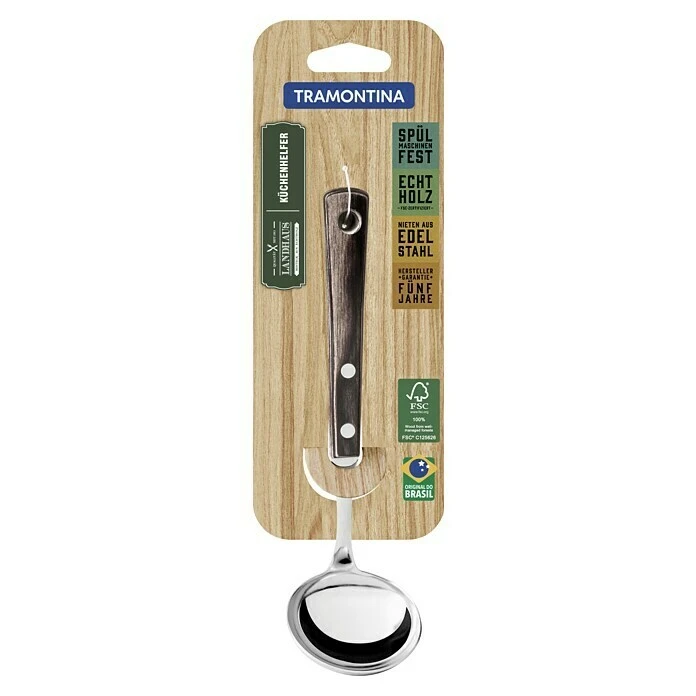 Mit der kleinen Schöpfkelle aus der Tramontina Landhaus Serie lassen sich stilvoll in der Küche und am Grill Soßen oder auch Glühwein servieren. Sie ist aus pflegeleichtem Edelstahl gefertigt, der Griff besteht aus imprägniertem Kiefernholz, sodass die Schöpfkelle auch problemlos in der Spülmaschine gereinigt werden kann.