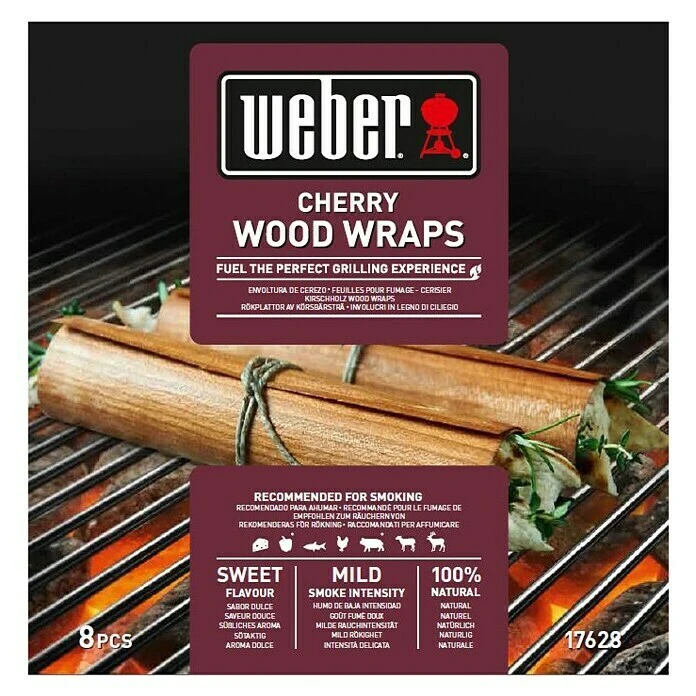 Die Wood Wraps von Weber sind kleine Kirschholz-Blätter mit denen sich die unterschiedlichsten Fisch- und Fleischsorten, Gemüse- und Obstsorten auf dem Grill garen lassen. Sie verleihen dem eingewickelten Grillgut, welches durch einen Faden fixiert wird, ein süßes, mildes Raucharoma. Im feuchten Zustand lassen sich die Wood Wraps sehr einfach gegen die Faserrichtung einrollen, weshalb empfohlen wird, sie vor der einmaligen Verwendung einzuweichen.